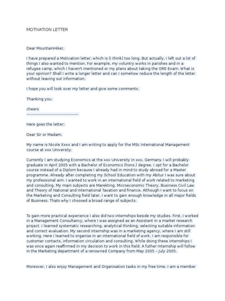 The motivation letter is used mainly on education, therefore there are various motivation letters. Whereas, the cover letter is used mainly to apply for jobs. Motivation letters are not required for every application. A motivation letter not only suitable for the job but for the various platforms such as scholarship, admission in the university, joining for an internship placement. Motivational letter example for master's degree program in sound and music computing in this article we bring you motivational letter example for master's degree program in sound and music computing. This is a genuine motivatio letter written by a student who would like to study sound and music computing in barclona. The motivation letter usually refers to an application letter you would write when applying for a university. She is applying for a ph.d. Motivation letter sample for job application example a letter of motivation for a job contains your address, the address of the company, salutation, body, and complimentary close with signature. Motivation letter for university is one that helps any university to find or select the right candidate for the courses. It's usually attached to your resume when applying for a job. But before we proceed to motivation letter for job application, we'll explain the main difference between cover letter and letter of interest. For example, you may need a letter of motivation for scholarship, a letter of motivation for university admission and so forth.